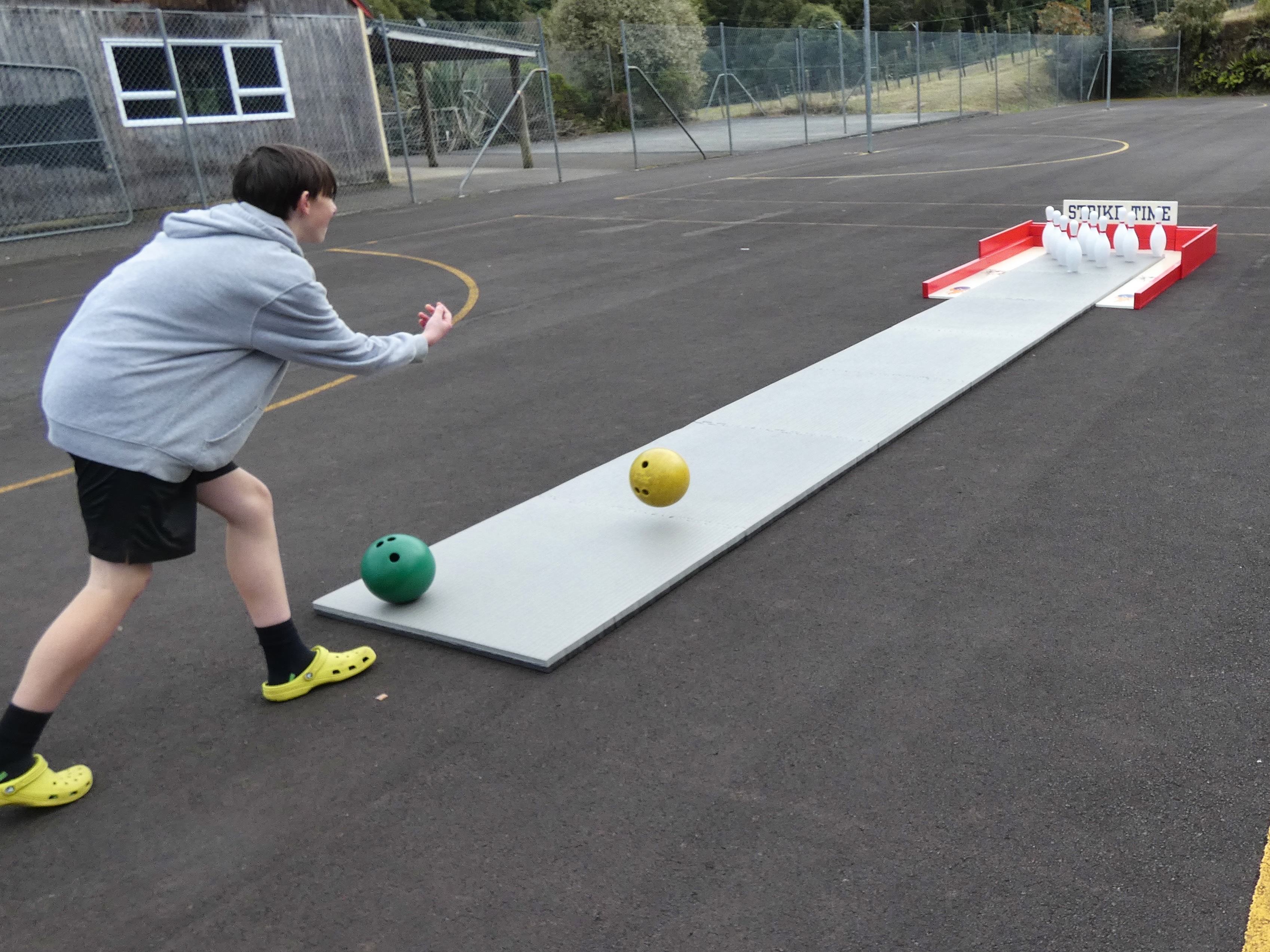 *Painted wooden backboard and side gutters stop bowling ball getting on the loose.